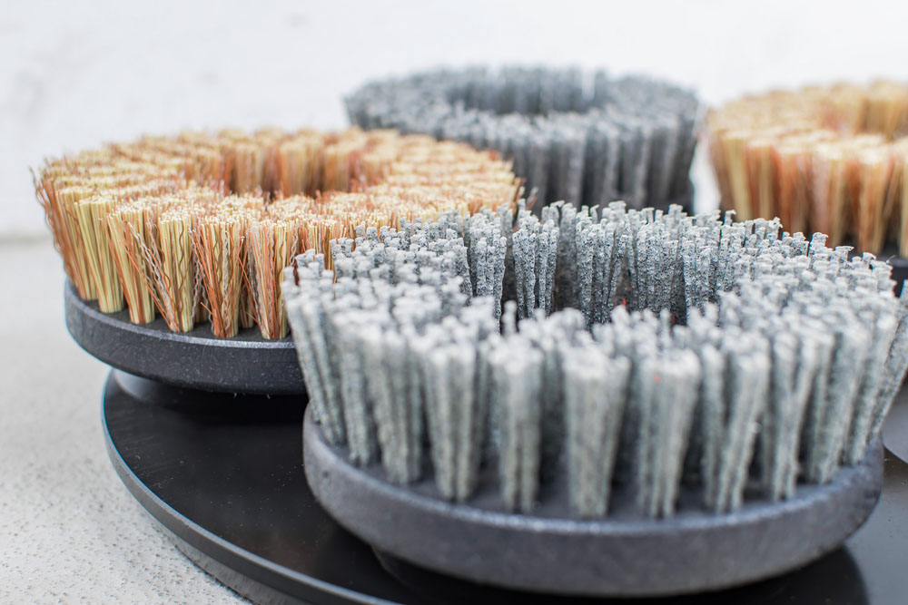 Bei einem Masterteller von 21“ oder ca. 533mm Durchmesser haben die unteren sieben Subbürsten einen Durchmesser von nur 6“ oder ca. 150mm. Das Verhältnis der Wirkradien ist etwas geringer, weil die Steckachsen ein wenig vom Rand des Mastertellers nach innen rücken, um einen soliden Verbund des Lagersystems der Steckachsen aus doppelten Schräglagern aus Edelstahl auch im Randbereich des Mastertellers sicher zu stellen. 6“ ist ein Standarddurchmesser für Padsysteme, die alle zöllig analog zu Rohrmaßen hergestellt werden. Der Grund liegt hierfür in der Markteinführung durch das amerikanische 3M Konglomerat gefolgt durch die Firma Glitt, ebenfalls USA-stämmig.